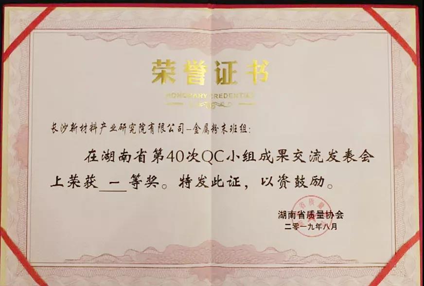湖南省第40次质量管理小组成果交流发表会由湖南省质量协会在江西上饶组织召开。会上,140多个企业质量小组发表了质量控制、质量管理、质量问题解决方案、班组质量体系建设等成果,并由专家评委现场打分。其中,湖南航天新材料院金属粉末班组脱颖而出,获现场专家评委一致好评,斩获一等奖。