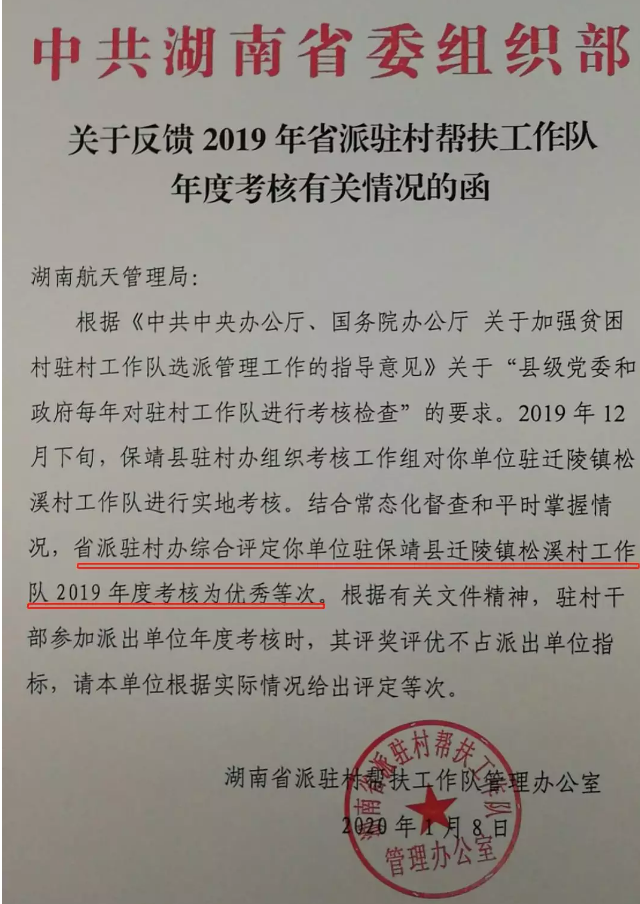201912月下旬,省派驻村办综合评定湖南航天驻保靖县迁陵镇松溪村扶贫工作队2019年度考核为优秀。