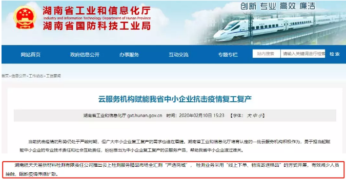 湖南航天天麓公司全汇测“严选商城”成功入选湖南省工业和信息化厅培育认定的云服务机构,助力中小企业复工复产,为检测产业持续发展保驾护航。