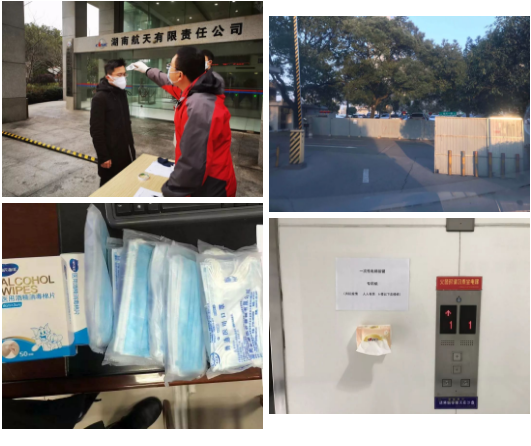 湖南航天采取了发放防控疫情物资给职工、在科研楼大门口设置两个体温检测处,对进出大门口的人员进行体温检测、检查各单位复工方案、党委领导带队“四不两直”对各单位落实的复工方案情况进行检查、采取交替上班、云端在线上班等多种灵活上班方式、组织开展复工上班方式申报、落实各单位人员基本情况、全员签订《疫情防控承诺书》、组织各单位签订《疫情防控责任书》、在科研楼大厅LED屏、广告机、电梯间等宣传阵地播报疫情防控内容、为减少感染,6层以下电梯暂停使用,鼓励员工爬楼梯、设置废弃一次性口罩专用垃圾桶、为职工提前预定餐饮,并打包分装派送到人,分时分餐,避免食堂聚餐、厂区实行全厂封闭管理。