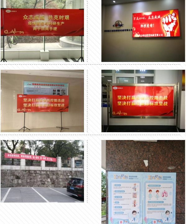 本部和所属各单位累计制作战“疫”复工横幅27条,展板16块,张贴海报175张,在11块电子屏和1台广告机上滚动播放宣传标语。其中湖南磁电制作了80本防疫宣传册发给职工学习,本部党群部、安保部,所属诚远公司、天麓公司通过制作防疫电子手册、PPT等形式组织职工开展广泛疫情防控学习。