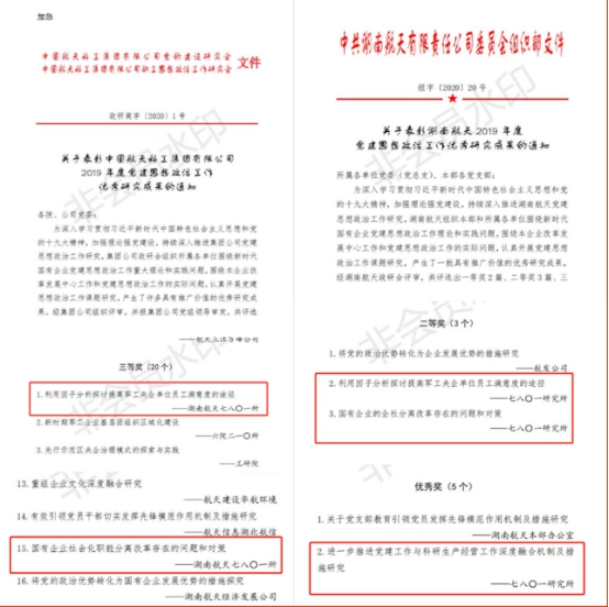 《利用因子分析探讨提高军工央企单位员工满意度的途径》、《国有企业的企社分离改革存在的问题和对策》湖南航天2019年度党建思想政治工作优秀研究成果优秀奖: