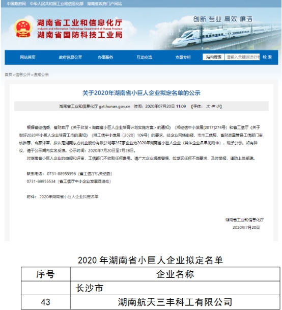 近日,湖南省工业和信息化厅官网关于2020年湖南省小巨人企业名单公示结束。经市州工信局、省财政直管县工信部门审核推荐、专家评审,认定267家企业为2020年湖南省小巨人企业,其中湖南航天三丰公司榜上有名。