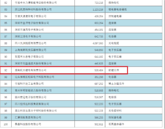 日前,中国电子元件行业协会根据2019年行业骨干企业的规模实力、财务状况、技术研发等综合能力,评选并发布了2020年(第 33 届)中国电子元件百强企业名单,湖南航天磁电公司成功上榜。