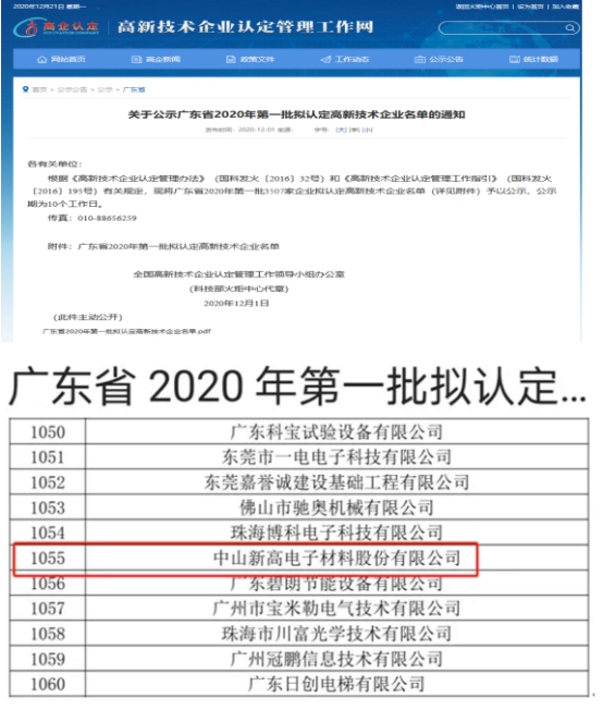 根据《高新技术企业认定管理办法》(国科发火〔2016〕32号)和《高新技术企业认定管理工作指引》(国科发火〔2016〕195号)有关规定,对广东省2020年共三批企业拟认定高新企业技术企业名单进行了公示,中山新高电子材料股份有限公司喜获广东省2020年第一批认定高新技术企业名单。这是继2017年后,中山新高再次获评国家高新技术企业。