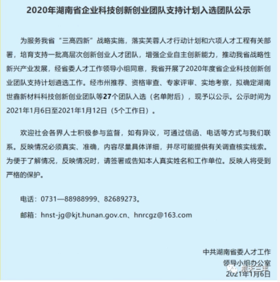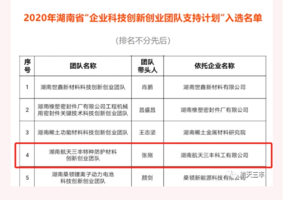 1月12日,湖南航天三丰科工有限公司特种防护材料创新创业团队成功获批湖南省企业科技创新创业团队。
