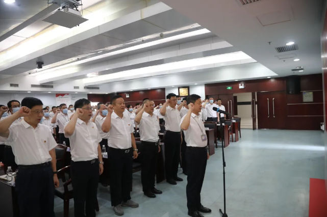 面向鲜红的中国共产党党旗,在湖南航天党委副书记、总经理焦继革的领誓下,新党员代表进行入党宣誓,其他与会党员重温入党誓词。