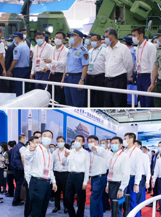 许其亮、王勇和军队、地方、上级机关领导视察中国航天科工展厅。中国航天科工集团有限公司携全域攻防装备七大体系、113项装备展品重磅亮相,以HQ-9BE远程防空导弹武器系统、YJ-18E潜射导弹武器系统等大国重器为代表的50余型先进装备首次亮相,全面展示中国航天科工在加快武器装备现代化建设和航天强国建设等方面的发展成果,充分诠释“践行初心使命,推动高质量发展,建设世界一流航天防务集团公司”的参展主题。