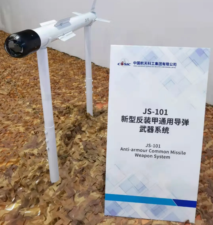 JS-101新型反装甲通用导弹武器系统,兼顾单兵、车载和机载三种发射方式,在较大范围内对“低慢小”目标进行自主搜寻、跟踪和拦截,可兼顾对地面装甲、直升机、水面舰艇等目标的打击任务。
