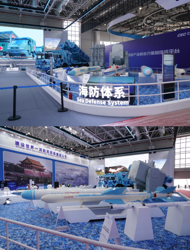在本次航展首次亮相的一体化海防武器系统,是对面打击体系产品集成化、模块化、系统化的整体解决方案,能够实现目标探测、指挥控制、火力打击、武器控制等功能,可以发射YJ-12E(CM-302)超声速导弹、CM-802B亚声速导弹等面对面打击武器,能够灵活装载于舰船、车辆等多种平台或直接固定使用。