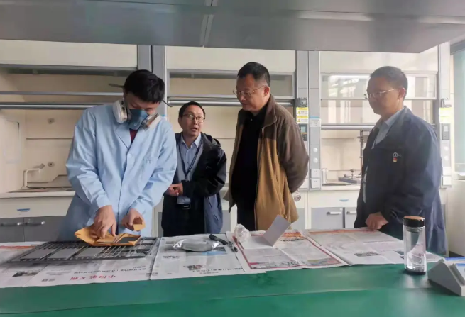 随后,陈波参观了三丰公司涂料研发实验室,与正在开展实验的研发人员进行了亲切交流。最后,陈波一行来到会议室与公司领导进行座谈交流。会上,三丰公司领导班子分别从公司基本情况、重点产品、科技创新、承接重点任务、党建、人事及安全等方面进行了工作汇报。本部部门领导等同志对公司预研工作和质量工作提出了很多宝贵意见。