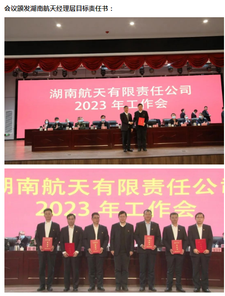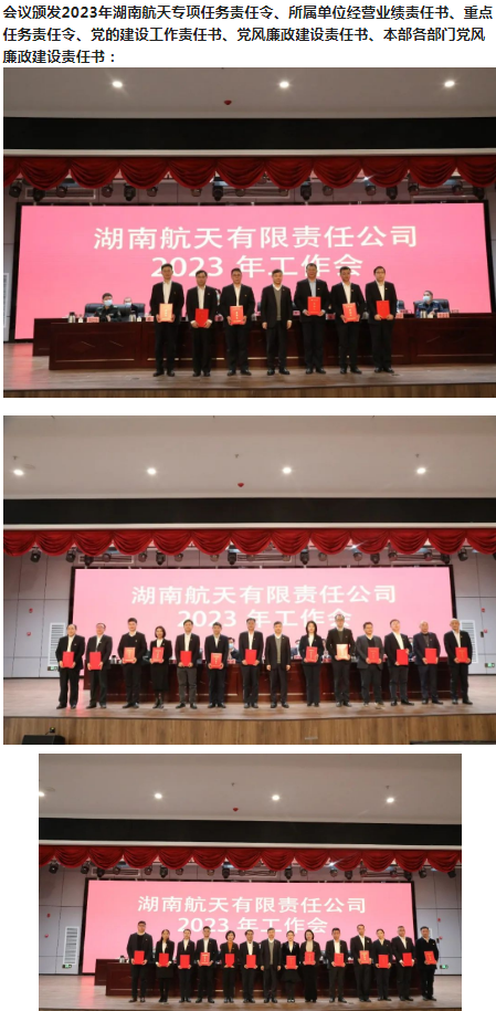 会议宣读了2022年度系列表彰决定.会议颁发2023年湖南航天专项任务责任令、所属单位经营业绩责任书、重点任务责任令、党的建设工作责任书、党风廉政建设责任书、本部各部门党风廉政建设责任书.