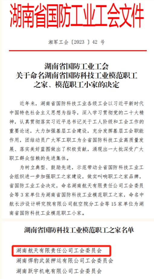 1.湖南航天有限责任公司工会委员会获评湖南省国防科技工业模范职工之家