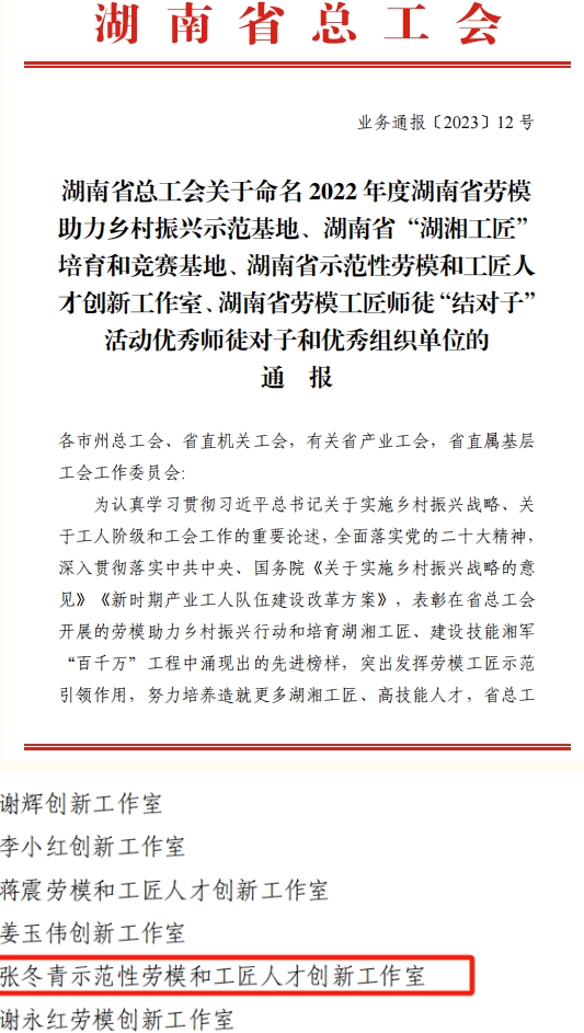 2.7801研究所张冬青示范性劳模和工匠人才创新工作室获评2022 年度湖南省示范性劳模和工匠人才创新工作室