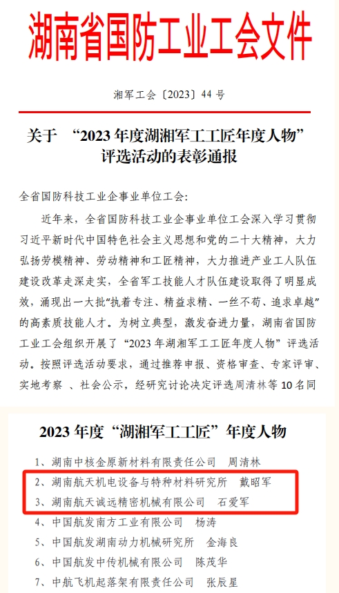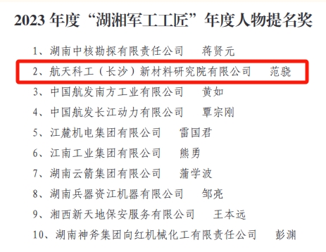 3.7801研究所戴昭军、诚远公司石爱军获评2023 年度“湖湘军工工匠”年度人物,新材料院范骁获评2023 年度“湖湘军工工匠”年度人物提名奖