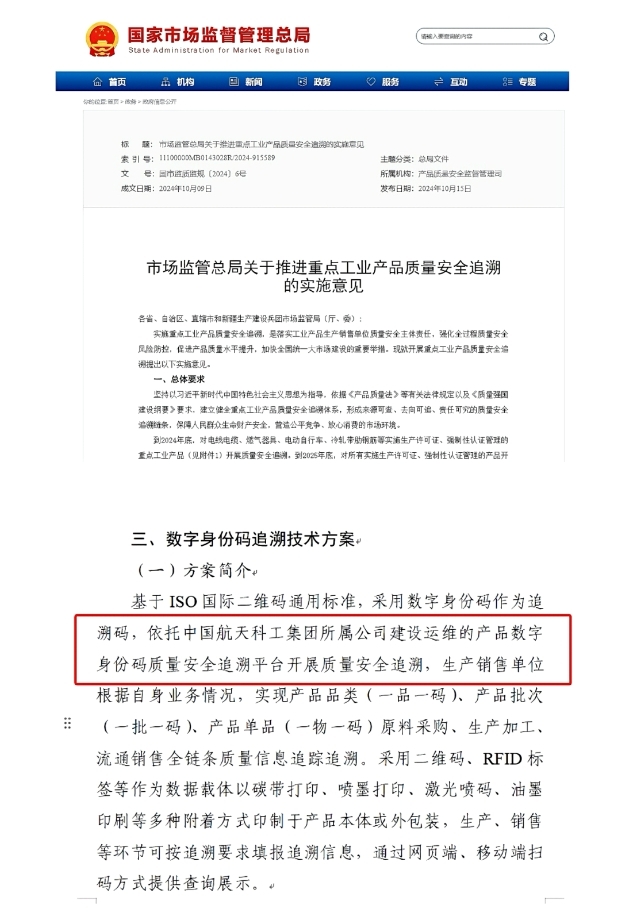近日,《市场监管总局关于推进重点工业产品质量安全追溯的实施意见》正式发布,湖南航天天麓公司研发运营的“产品数字身份码质量安全追溯平台”入选国家市场监管总局质量安全追溯技术方案。