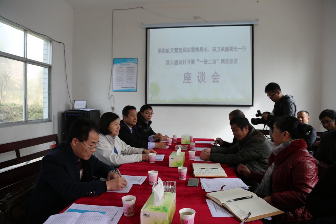 随后,与当地政府相关人员、村主干部、贫困户代表在村部召开了扶贫攻坚座谈会。座谈会上胡雪梅指出,一是此次调研扶贫工作主要目的是通过实地调研、了解驻村帮扶工作开展情况和帮扶需求,通过有针对性的帮扶工作,使通坝村和村民真正受益,同时也希望能够为保靖县的经济发展做一些贡献;二是湖南航天管理局在接到省委下达的扶贫工作任务后,非常重视,明确了相关责任、成立了专门的扶贫办公室,选派干部驻村帮扶,并以“个人做代表,单位做后盾”的扶贫理念,有计划、有针对性的开展各种帮扶活动,帮扶成效非常明显,尤其对近两年村内基础设施的不断完善,和村容村貌发生了巨大改变表示非常满意。她要求,驻村工作队和村主干部一道要多听取县、镇领导对村扶贫工作的意见,做好驻村帮扶工作,按期完成脱贫目标任务,确保2017年整村脱贫,通过各方面共同努力,将通坝村打造成美丽乡村的典范,并表示将在后期工作上给予大力支持。一是帮助联系专业人员做好乡村旅游项目建设规划,帮助通坝村打造乡村旅游扶贫的亮点和示范点。二是在县政府的统一部署和镇政府的引导下,帮助推动扶贫村对基础设施建设、农产品深加工、销售等各类精准扶贫项目的落地,将村集体经济更好地发展起来;三是利用航天企业技术优势,加强合作,帮助保靖县发展环保、服务等产业。