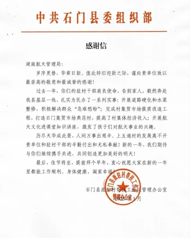 为感谢湖南航天一直以来对乡村振兴工作做出的积极努力。石门县派驻村帮扶工作队管理办公室近日特意发来了《感谢信》。