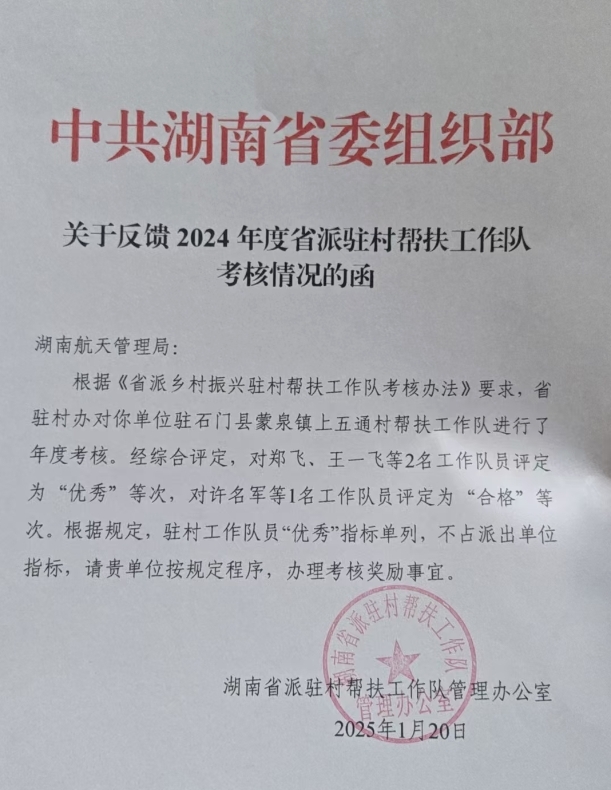 近日,湖南省委组织部公布了2024年度省派驻村帮扶工作队的考核结果,其中湖南航天驻石门县蒙泉镇上五通村帮扶工作队员获得了“优秀”等次。