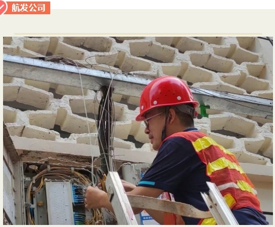 航天小区某区域出现网络故障,航发公司通信中心装维员邓子建迅速跨上电动车,载着30多斤重的工具箱,向用户家疾驰而去。抵达用户小区后,邓子建发现故障出在楼外的线路上。他二话不说,系好安全带,架梯子爬上去。烈日直射下,他小心翼翼地排查线路,汗水不断滴落,他只能时不时地抬起手臂,用袖子擦一把。经过近半小时的抢修,线路终于恢复正常。