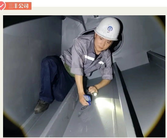 盛夏骄阳下,在狭小的半封闭空间内,三丰公司技术服务人员小唐猫腰蜷身,一丝不苟地进行油漆涂装检验,全然顾不得汗水湿透了双层衣衫,只为确保船舱各部位涂装质量可靠。