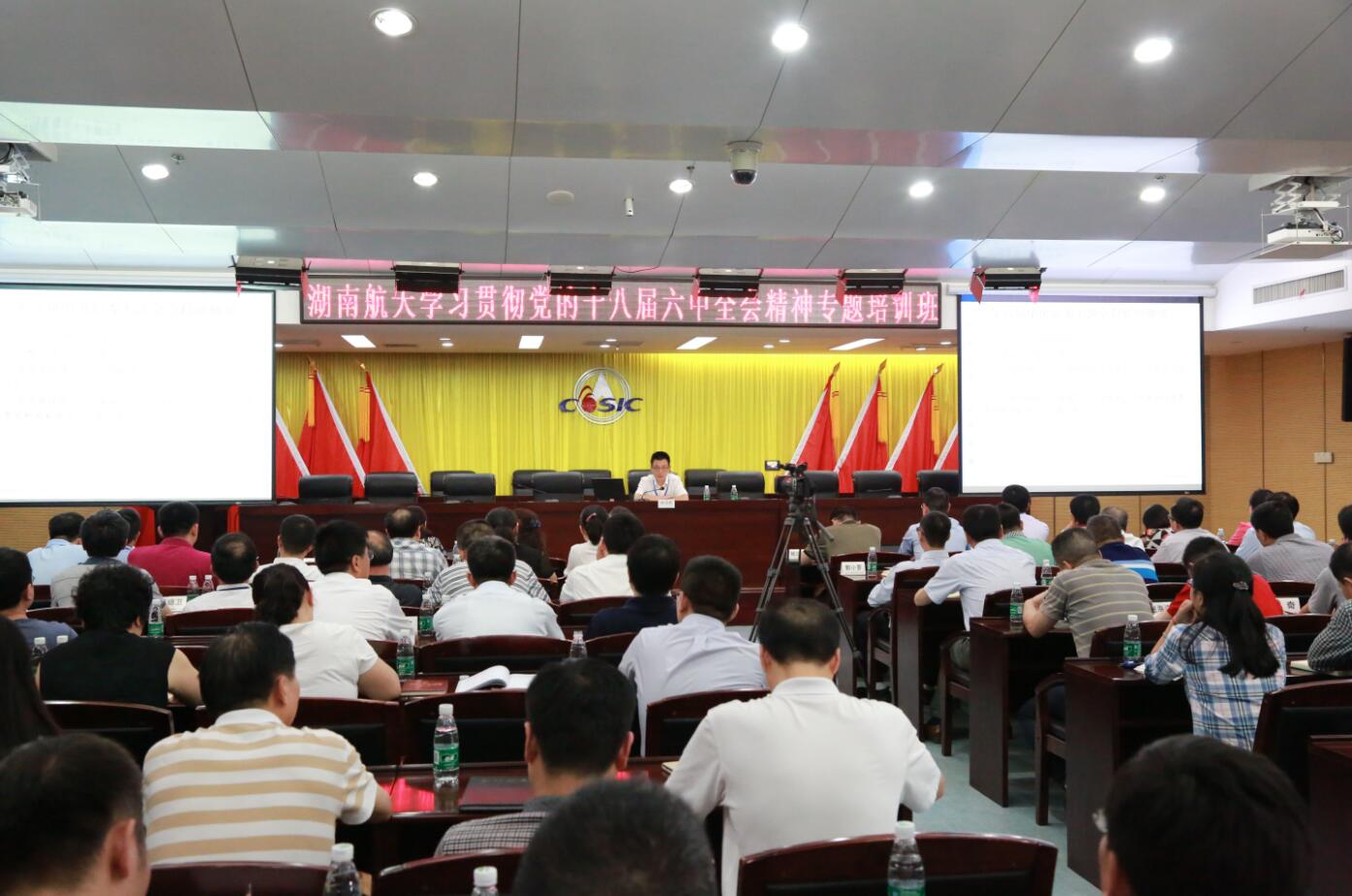 5月17日,湖南航天学习贯彻党的十八届六中全会精神专题培训班第二课开讲,湖南航天纪委书记韩海彬主讲《深入贯彻十八届中央纪委七次全会精神推动全面从严治党向纵深发展》党课。资深专务鲍定超,总经理助理王永森,本部全体党员,所属各单位班子成员、党群、人力、纪检监察部负责人,在职党支部书记,团委书记共150余人参加此次培训会。
