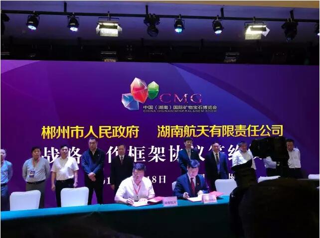 5月18日下午,第五届矿博会精彩活动缤纷继续。政府、企业、外宾等齐聚一堂,共同举办第五届中国(湖南)国际矿物宝石博览会招商推介会暨友好城市签约仪式。 中共郴州市委副书记、市政府市长刘志仁,省商务厅党组成员、副厅长周越,中共郴州市委常委、市政府常务副市长首建中,郴州市政府副市长李五一等出席推介会。湖南航天有限责任公司作为5家战略投资者之一,湖南航天副总经理宋卫武应邀参会并签订了战略合作框架协议。