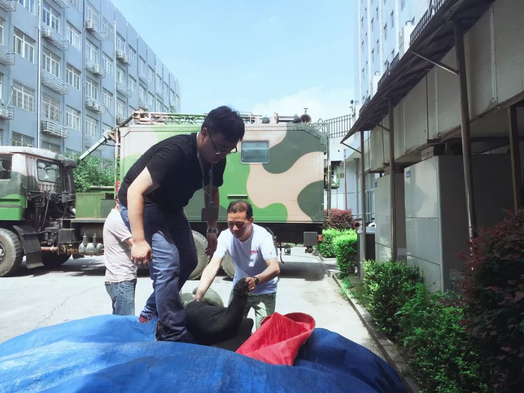 7801所办公室主任李锐带领大家进行应急处理:一组人员进行抢险,迅速搬运防汛沙袋,对走廊入口进行封堵,进行紧急排水;