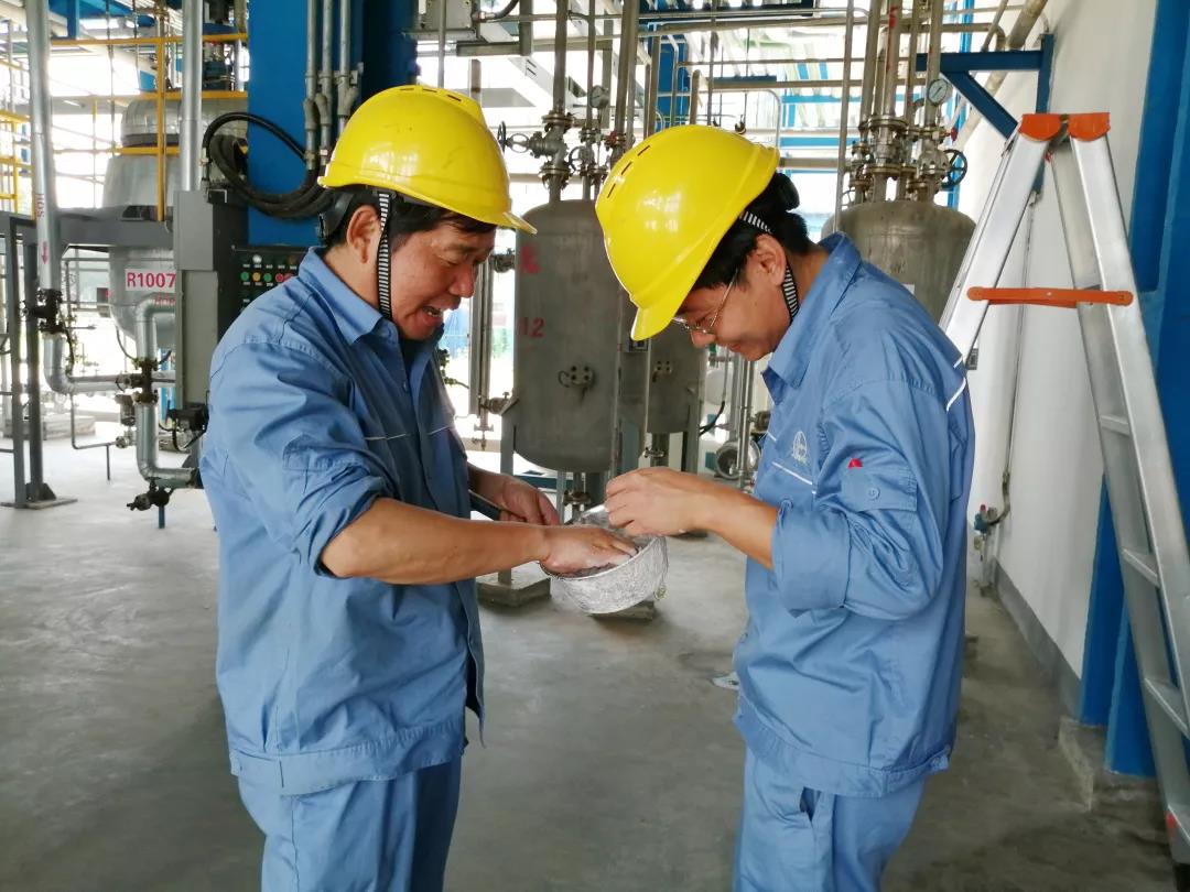 进入中试线设备调试阶段后,新材料院特种高分子材料事业部全体成员脱下实验服,换上安全帽和工装常驻岳阳,开启“5+2”“白+黑”工作模式,为聚酰亚胺产品试生产奋战。近日,聚酰亚胺中试线终于完成了第一釜中间体生产!当看到中间体从反应釜中出来时,现场工作人员都激动不已,满是汗水的脸上洋溢起灿烂的笑容。