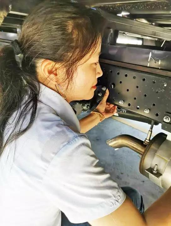 车辆维护保养本是男同志干的活,黄瑛、吴坤这两位“巾帼”也毫不示弱,随大家一起,钻到车下紧固螺丝,任凭汗水湿透衣背。