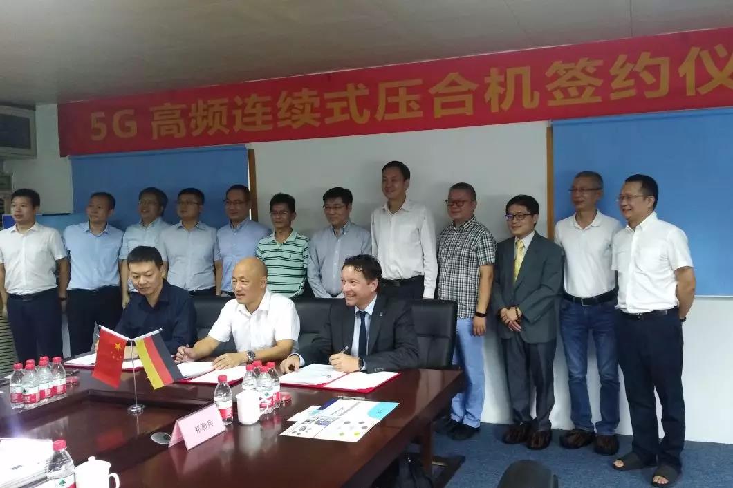 近日,中山新高与德国HELD Technologie GmbH公司(以下简称HELD公司)和深圳市普路通供应链管理股份有限公司(以下简称普路通),就5G高频挠性覆铜板产业化项目核心设备——5G高频连续式压合机采购举行签约仪式。