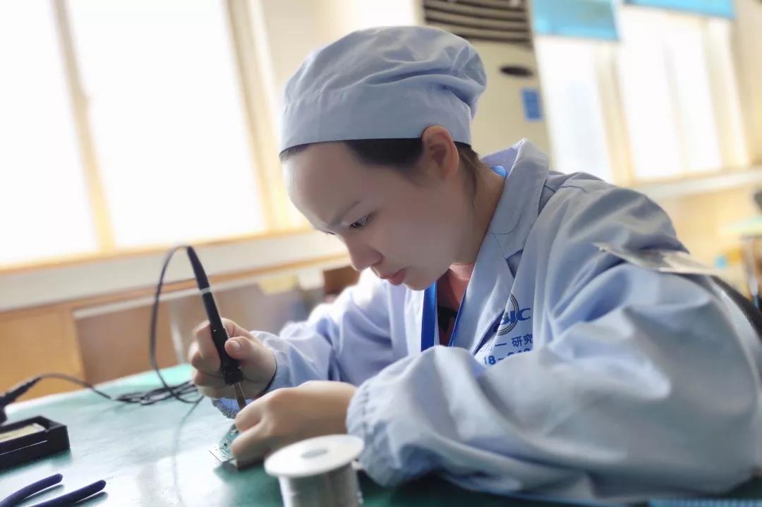来到新班组的邓慧群,从最基本的操作学起,以新人的角度审视新产品,提出不同的建议和见解,和有着丰富经验的老员工相互交流相互学习。通过不断地学习,邓慧群不仅能独立完成整套产品的接线装配工作,还成了接线组的顶梁柱之一。在工艺文件不完善的情况下,邓慧群主导完成了多个线束多、空间小、技术、精度要求高的高精密多轴项目首套产品接线工作。与此同时,邓慧群将自己总结的装焊技巧毫无保留的传给徒弟。慢慢的,邓慧群成为了最年轻的“小邓”师父,短短几年带了4 个徒弟。她说:不能辜负大家的信任,一定要让徒弟们学有所成,能独当一面。