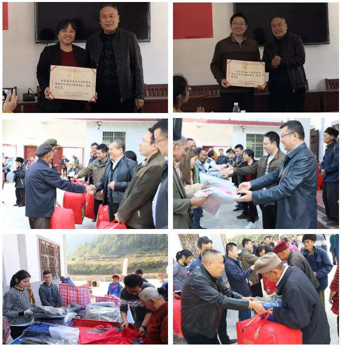 走访活动结束后,各帮扶负责人各自陪同村里70岁以上的老人和五保户一起来到松溪村村委会前,参加“寒冬送温暖,衣被暖人心”活动,原本空旷的村委会小广场顿时显得热闹了起来。一套套棉服、棉被带着湖南航天全体职工的关爱与祝福来到了松溪村,给这里的冬日增添了别样的“温暖”。本次活动中湖南磁电公司共捐赠了价值60000元的120套棉服,湖南航天凯天共捐赠了价值9000元的45套棉被。