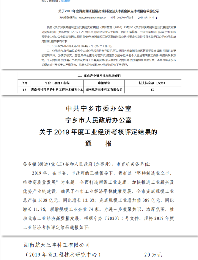 近日,湖南航天三丰公司“湖南省特种防护材料工程技术研究中心”项目拟获湖南湘江新区50万元资金支持。该项目同时入选宁乡市“工业企业品牌(平台)奖”,并获得20万元奖励。