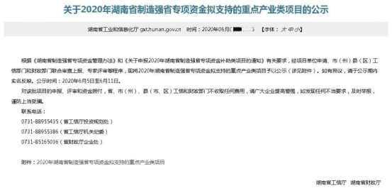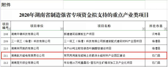 近日,湖南省工信厅正式公示2020年湖南省制造强省专项资金拟支持的重点产业类项目,湖南磁电的“军民两用高性能稀土铁氧体永磁材料产业园区建设”项目成功入选。