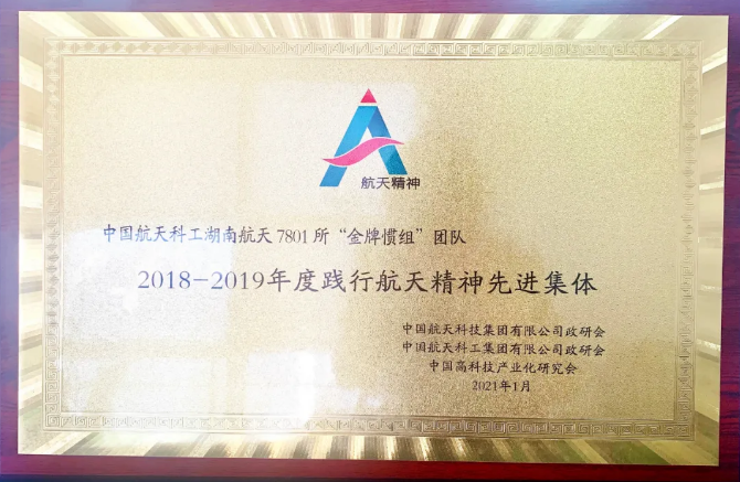 由中国高科技产业化研究会主办,中国高科技产业化研究会航天精神研究分会和中国航天报联合承办的2018-2019年度“践行航天精神先进集体”评选结果已公布,湖南航天7801研究所“金牌惯组”团队荣获践行航天精神先进集体。