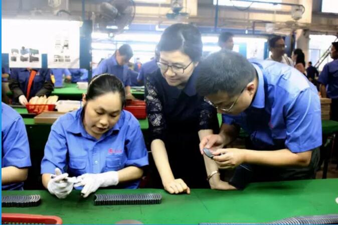 6月2日下午,068基地主任胡雪梅冒雨来到湖南航天磁电,再为公司健康发展仔细把脉,基地党委书记唐应伟、副主任罗传勇等领导陪同考察。 胡主任一行查看了铁氧体瓦磁制造部生产线智能化和自动化改造实施进度,详细询问了烧结钕铁硼生产线完善情况,并对磁电公司的预烧料生产线建设、微波炉磁产品开发等新项目的进展进行了深入了解。公司总经理郑自儒陪同调研,并代表领导班子向胡主任详细汇报了公司今年1-5月份生产经营情况及后续工作计划。