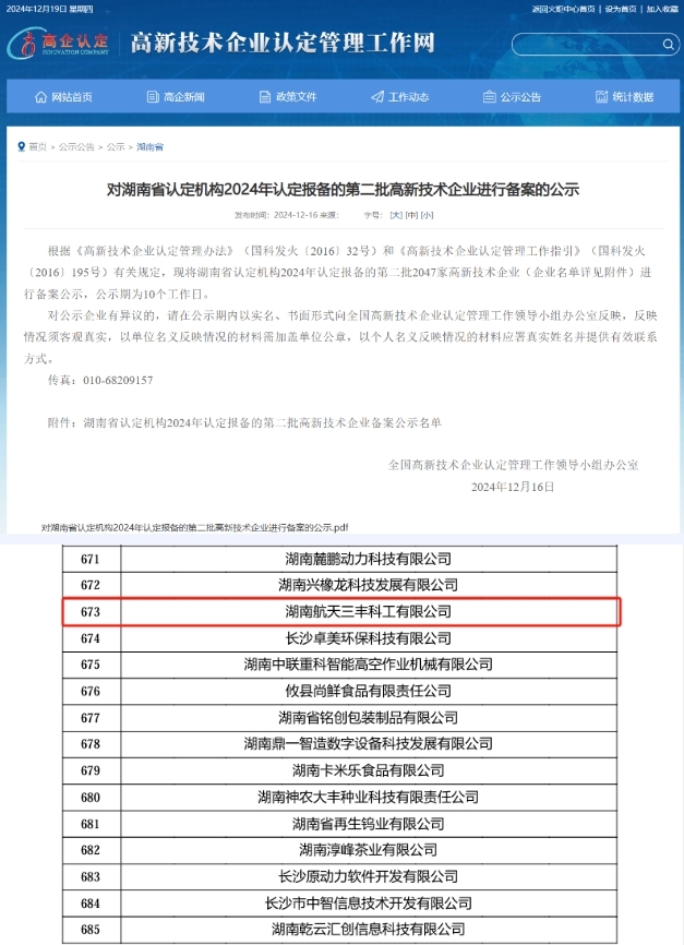 近日,全国高新技术企业认定管理工作领导小组办公室发布“对湖南省认定机构2024年认定报备的第二批高新技术企业进行备案的公示”,三丰公司顺利通过“国家高新技术企业”复审。