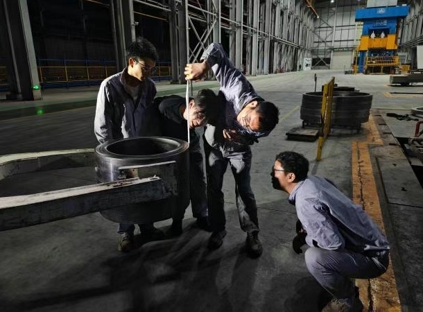 车间内,叉车的轰鸣奏响了奋斗的旋律。一位叉车司机熟练地操作设备,将锻件稳稳抓起。4 名技术、生产骨干迅速围拢过来,手中的卷尺成为他们攻克技术难题的有力“武器”。他们专注地测量每一处尺寸,目光在锻件与测量数据间来回切换,不放过任何一个细节。
