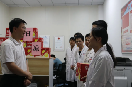 航天凯天环保党总支书记、董事长宋卫武带队为航天凯天装备事业部生产人员送去凉茶、面包等“清凉”物资。