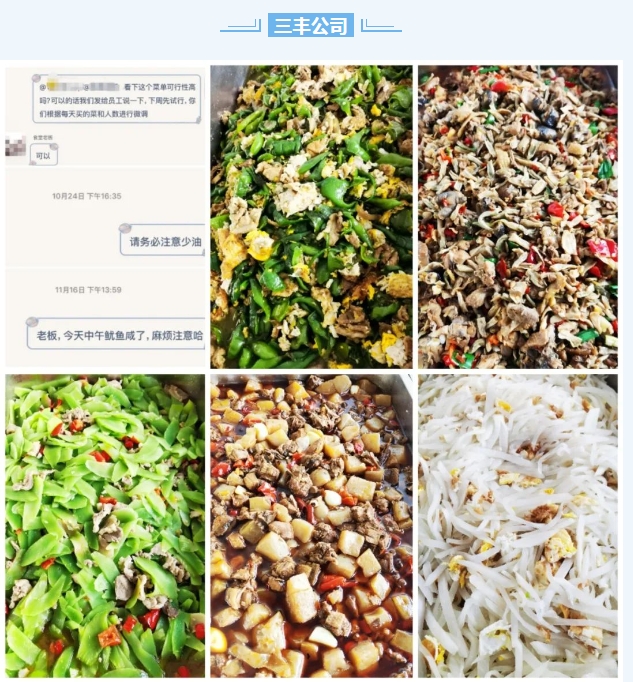 为推进膳食平衡,构建健康饮食体系,针对职工提出的“食堂饭菜太过油腻,需要提升口味”等问题,三丰公司积极响应,通过与食堂沟通每周菜单、定时收集员工反馈意见并及时督促食堂进行改善等方式,不断提升员工食堂餐饮质量。后续,三丰公司也将持续推进该项工作,不断收集员工意见,并考虑引入供应商竞争机制,切实保障员工用餐质量。