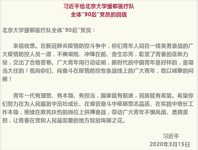 中共中央总书记、国家主席、中央军委主席习近平3月15日给北京大学援鄂医疗队全体“90后”党员回信,向他们和奋斗在疫情防控各条战线上的广大青年致以诚挚的问候。