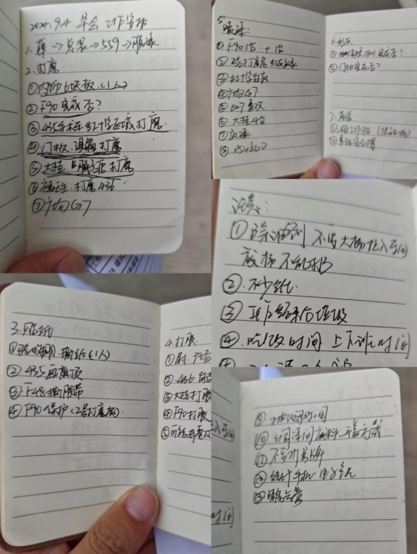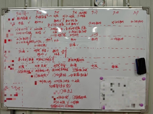 白板上随时更新的工作进度、小本子上记录的注意事项……为了确保每天的任务计划都能够顺利推进,我通常会提前到早上7:20抵达车间现场,检查车间情况,再次检查计划,这要花半个小时的时间。随后,我会利用10分钟的时间组织施工队开早班会,给他们布置详细工作。当时钟走向早上八点整,一天的现场工作就正式拉开帷幕了……早上8:00-晚上21:00,就是我在项目现场的正常工作时间。回到在项目的宿舍后,我还要开展复盘工作。就这样,我想尽一切办法,把自己从“新人”变成了“老手”,面对数十个人的施工队一点儿也不怯场,有条不紊地给他们布置工作。