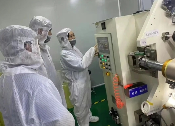 说着,她俯身拿起工具,熟练地示范起来:“你看,先将收卷机气胀轴上穿上PVC管充气,旋转PVC管直径将产品拉紧拉平,将气胀轴充气,使PVC管固定于气胀上, 手动旋转PVC管检查气胀轴与PVC管间张力,将其固定。” 在崔会丽的耐心指导下,杨巧梦逐渐掌握了技巧,顺利完成了产品上机生产,紧锁的眉头也舒展开来。